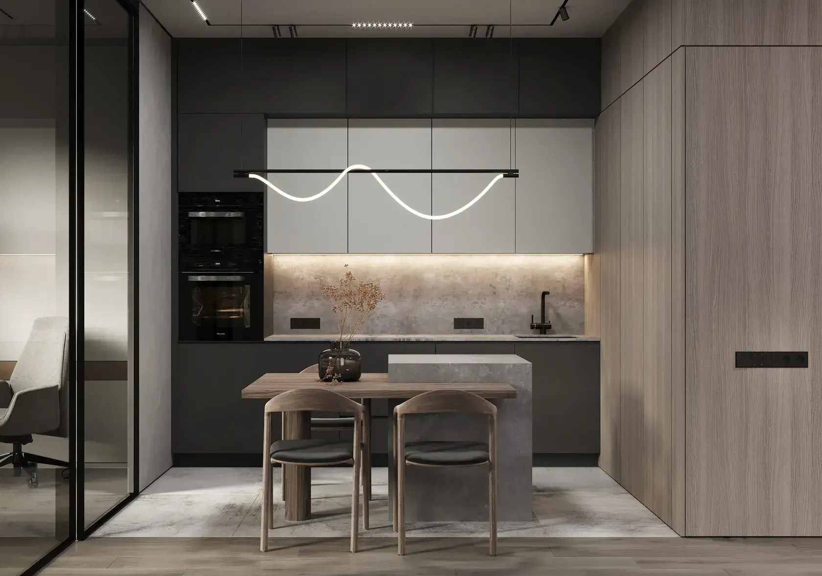 - каменная столешница и тёплые деревянные детали рядом