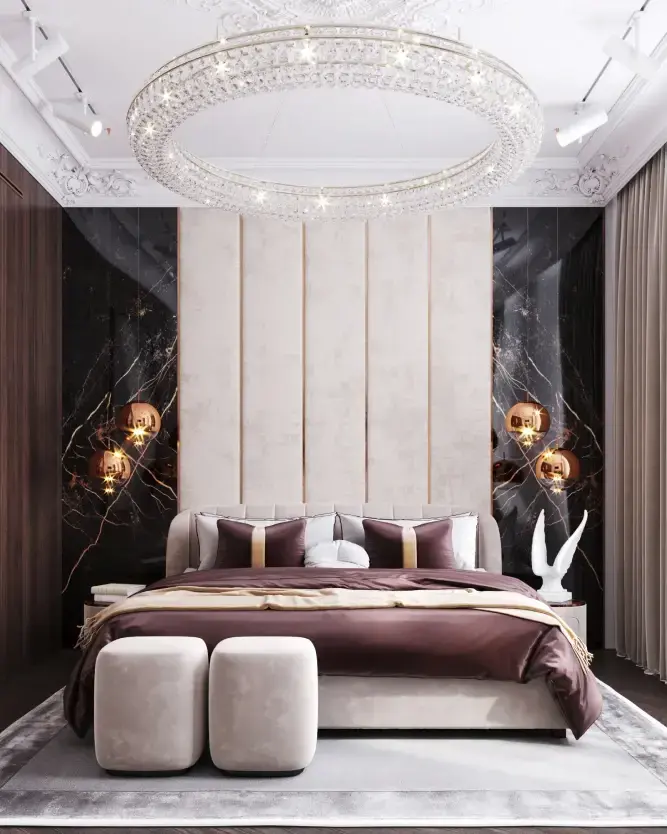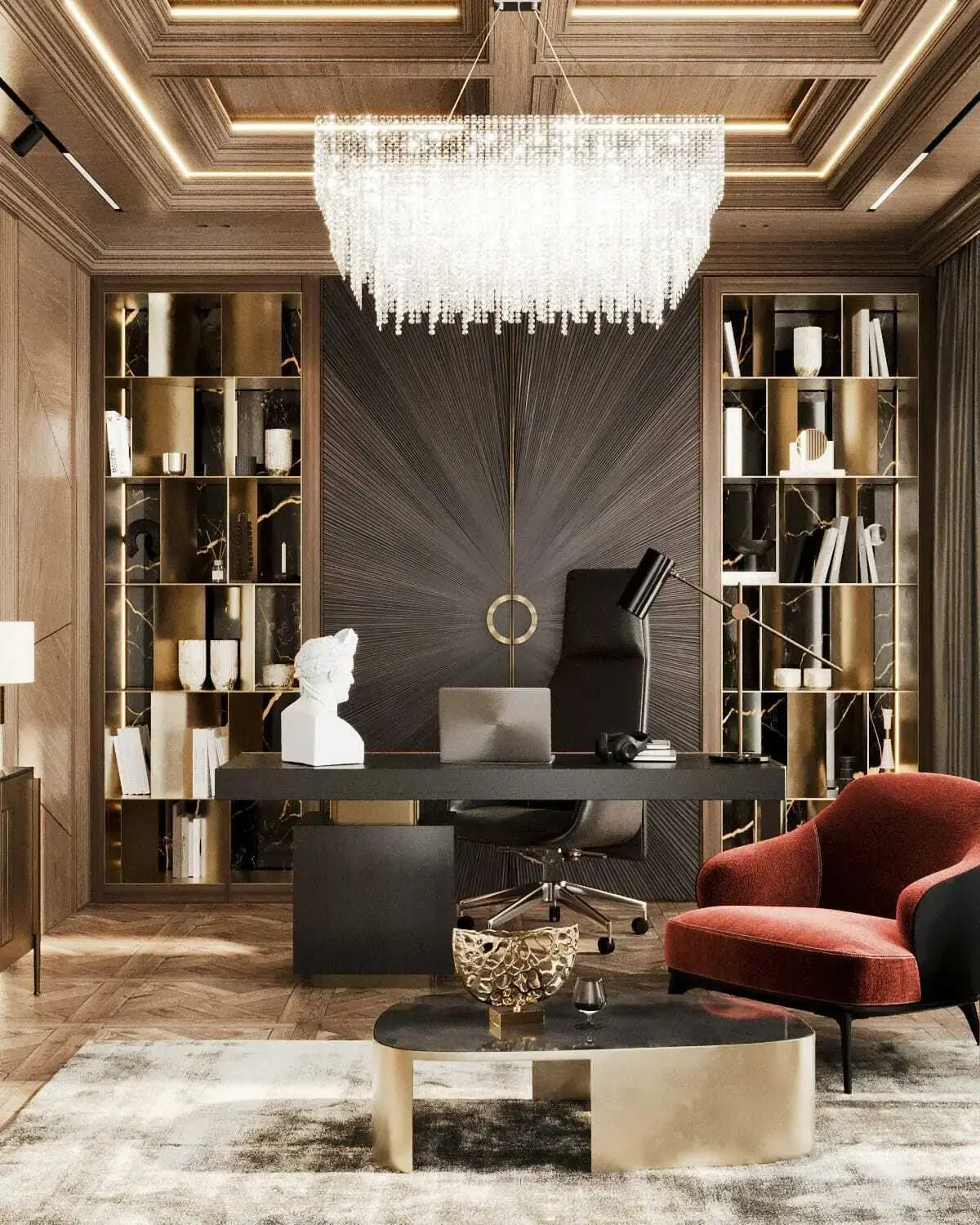 Спальня приобретает уют за счет бархатных штор и мягкого скрытого света вдоль потолка, где классические элементы составляют около 25%. Кабинет получает глубину от деревянных панелей на одной стене и открытых полок для книг, доводя классику до 30% акцентов.