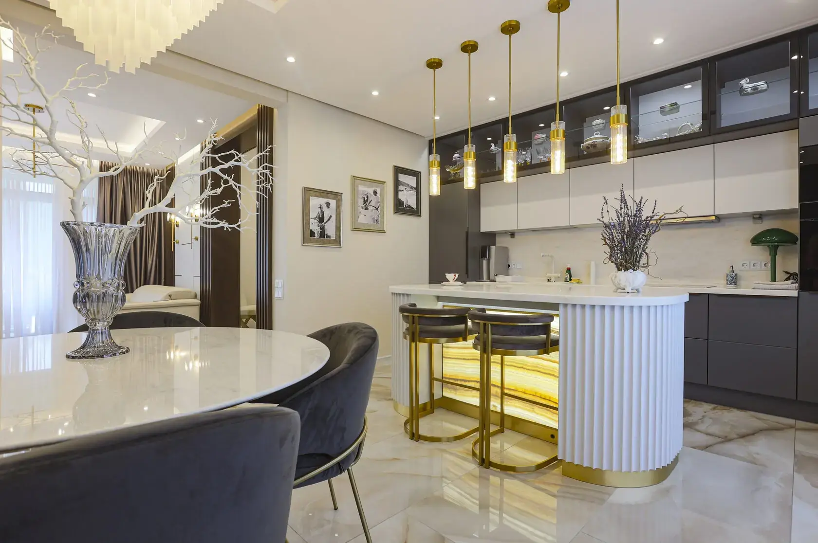 Кухня строится просто и функционально, с мраморной столешницей и лепниной только на фартуке над рабочей зоной. Доля классики ограничивается 15%, остальное — гладкие фасады шкафов без ручек и встроенная техника. Такой подход в дизайне интерьеров делает пространство удобным для готовки.