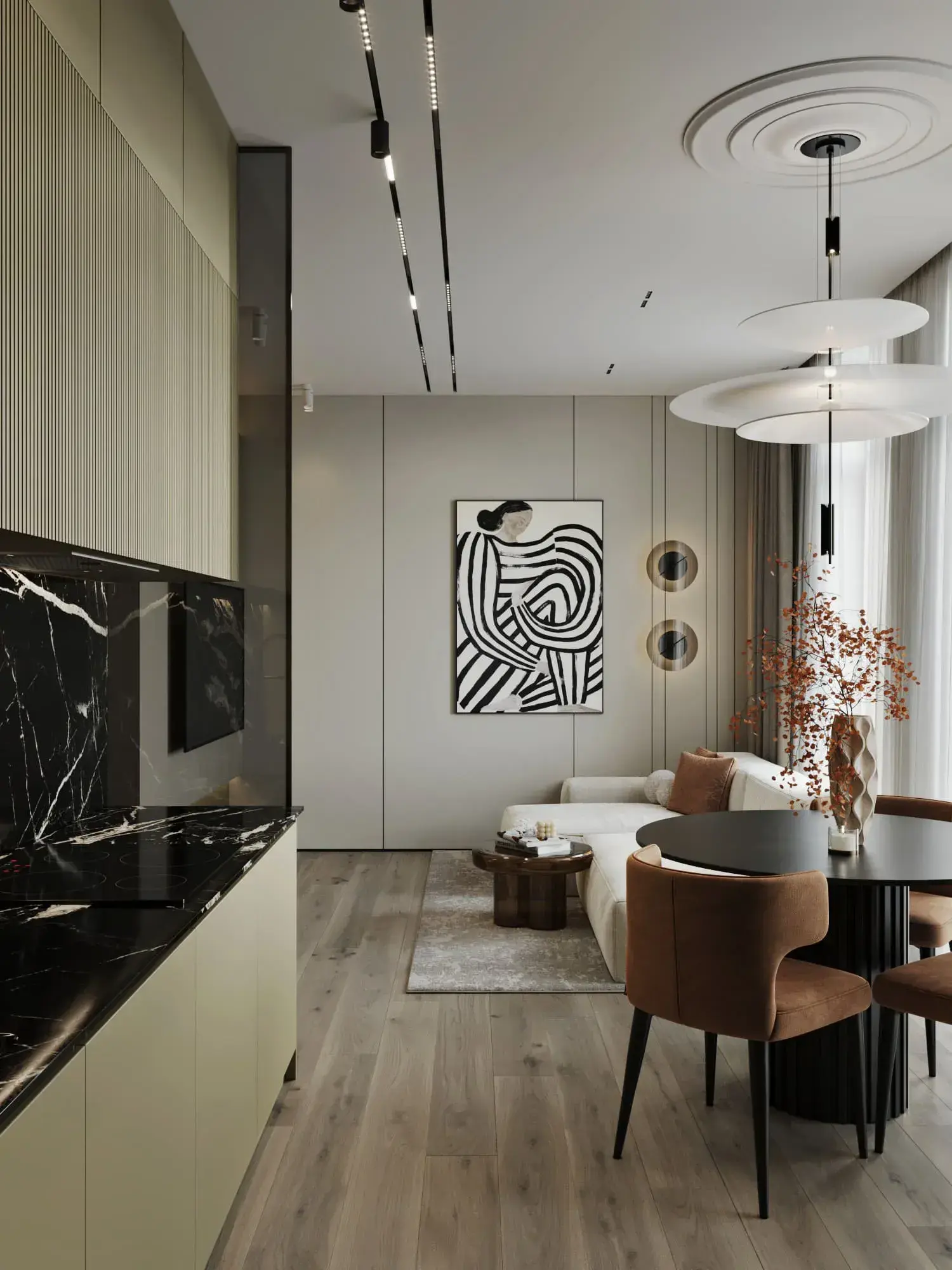 Отдельная тема свет. Один подвес над столом, локальный свет над рабочей поверхностью, торшер или бра в зоне дивана. Вечером вы просто включаете нужные источники и сразу чувствуете, где сейчас центр жизни. Кухня может легко уйти в фон, а гостиная стать более камерной, даже если это одно помещение.