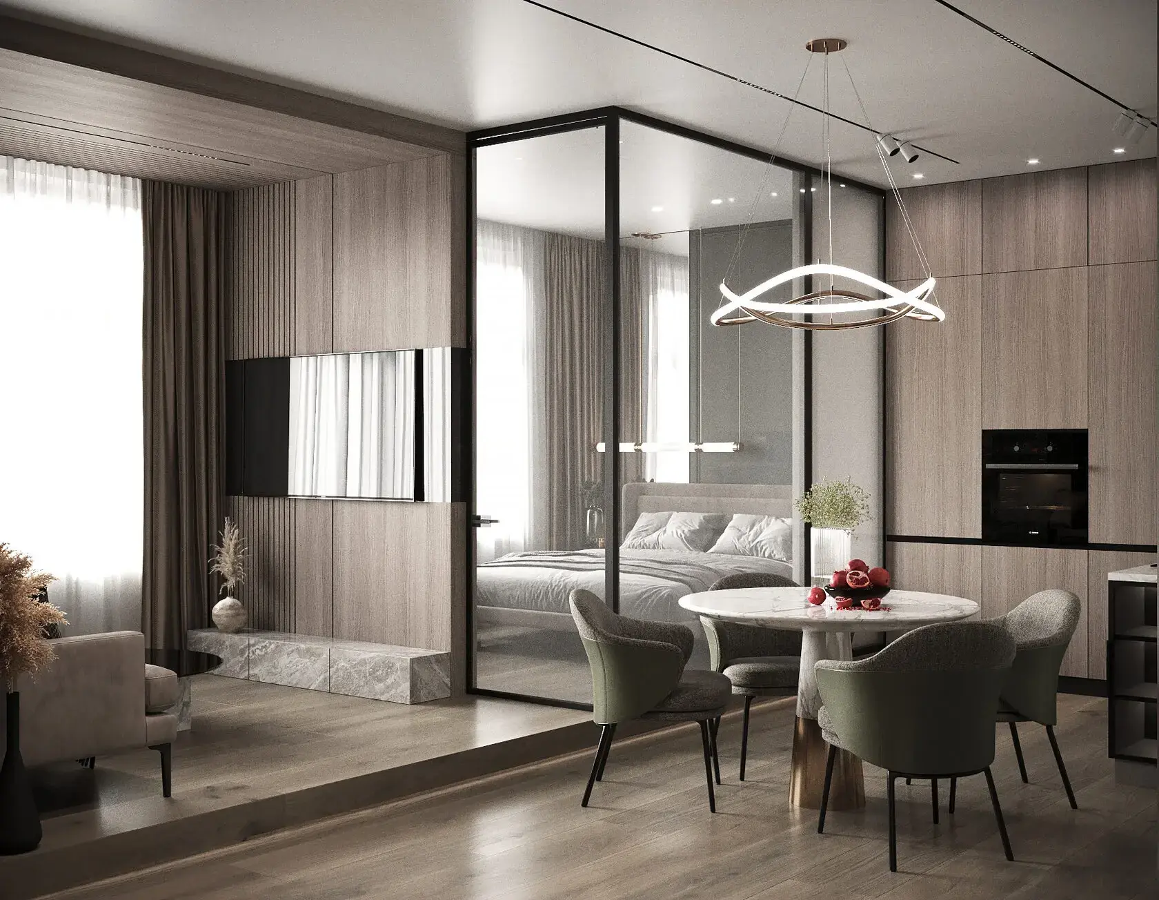 Если нужно чуть больше уединения, подойдут лёгкие перегородки. Раздвижные панели, стекло с тонким профилем, плотные шторы от потолка до пола. Их можно закрыть, когда хочется отделить кухню во время готовки или создать более спокойную атмосферу, а в остальное время убирать и снова возвращать ощущение открытого пространства.