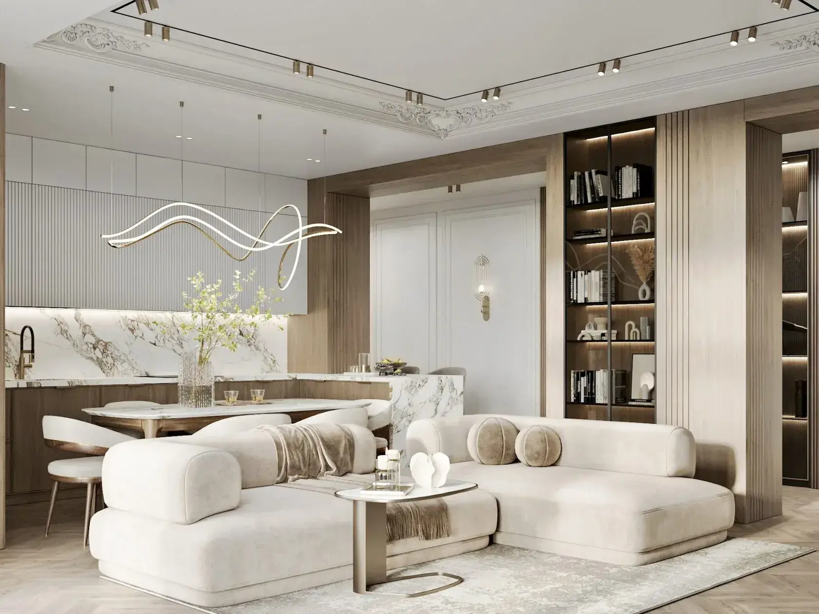 В объединённой кухне и гостиной цвет и фактуры должны «дружить» между собой. Тогда пространство читается как одно целое, а не как случайный набор зон. Лучше сразу договориться о базовом фоне и паре повторяющихся материалов, а не пытаться уместить все любимые оттенки в одной комнате.