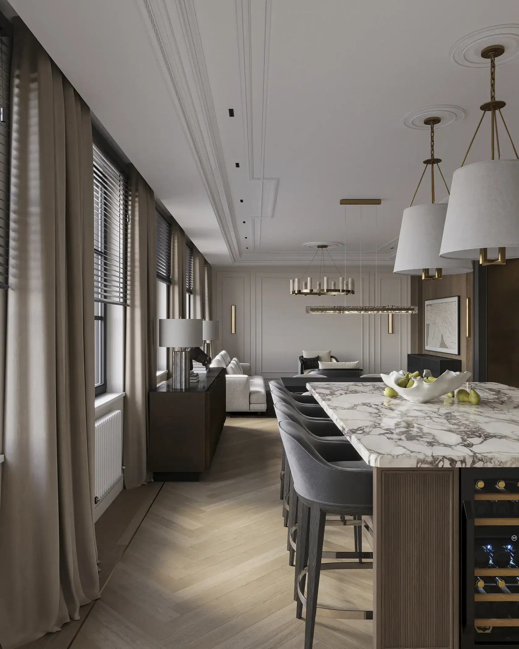Цвет и материалы работают в одну сторону, создавая ощущение единого, спокойного пространства, в котором легко находиться каждый день.